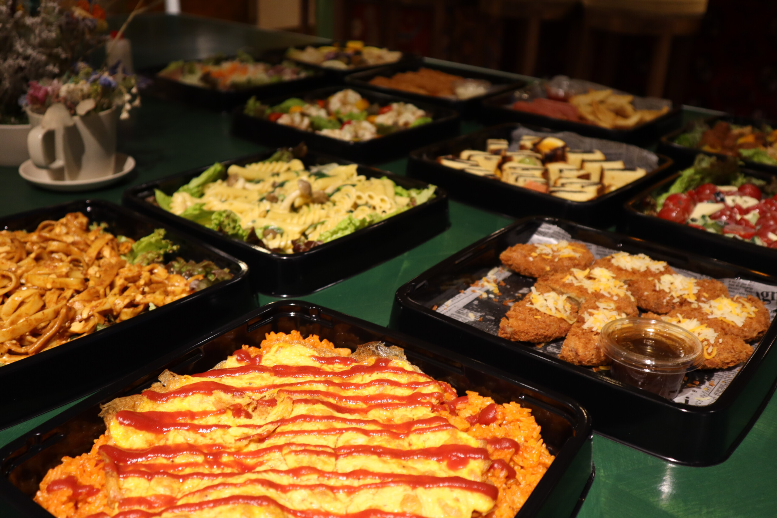 オリーブとプチトマトのカプレーゼ風/ソーセージ盛り合わせ/ハーブソルトフレンチフライ/ミートボールのアヒージョ/ピーマンのグリルとポテトサラダのバルサミコソース/キノコとほうれん草のクリームペンネ/タルタルチーズメンチカツ/野菜とレモンのグリルチキン/エビフライ/ボロネーゼパスタ/オムライス/フルーツとカステラのスイーツプレート